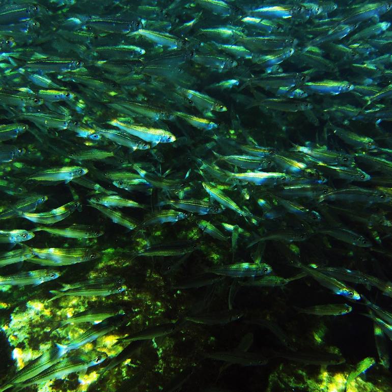 the sea moves me and I let myself go until I find colors and worlds that alter my perception. I chose to print it on cotton paper because it gives it a plus, which is its texture, and the colors expand The schools of sardines in the Riviera Maya, Akumel, in season move and ripple that make you joi...