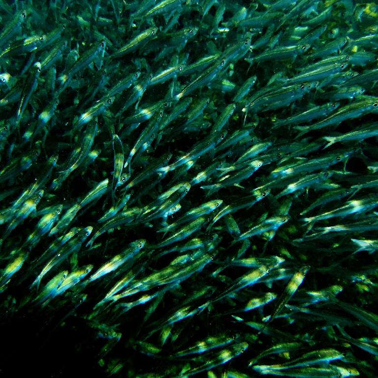 the sea moves me and I let myself go until I find colors and worlds that alter my perception. I chose to print it on cotton paper because it gives it a plus, which is its texture, and the colors expand The schools of sardines in the Riviera Maya, Akumel, in season move and ripple that make you joi...