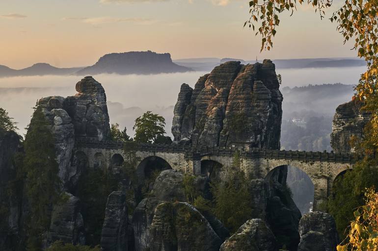 The Bastei Bridge, Saxony Cliffs, Germany. It's a steep climb - seems even steeper before dawn - but it's an amazing view once you've caught your breath. I remember taking the photographs up there around 7.00am and watching other photographers running across the bridge to catch the dawn's early ligh...
