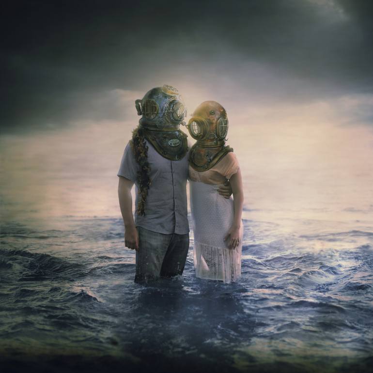 Couple wearing vintage scuba helmets standing in the water.