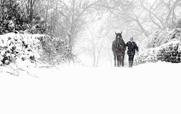 This image shows a young woman who has just rescued her horse from a nearby field and is now leading it down a winter country lane - homeward to take shelter. I love the precious bond between the two and can imagine the animal's anticipation - the smell of a fresh straw in a dry stable out of the c...