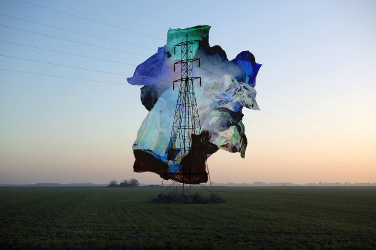 Plastic waste - the remains of consumerist urges - reflects both the world we live in and its influence on us. Using the wind as a metaphor for both uncertainty and hope, plastic waste is adrift, menacing travelers from the sky as they drive down the road. Wind turbines and electricity towers form ...