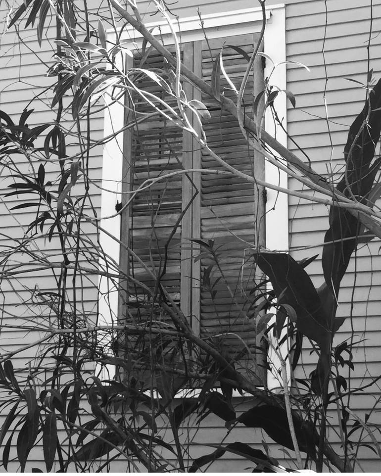 The wooden shutters are closed against the warm sun and tropical foliage. A midsummer moment in New Orleans with the air thick and the houses shuttered against the Southern tropics and impending storm.