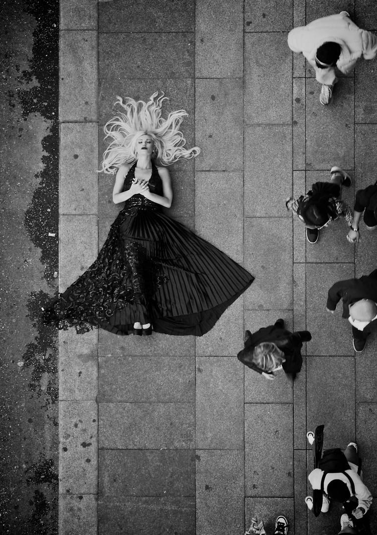 Shot spontaneously from a hotel balcony in Madrid, this image captures a surreal moment in the middle of the city’s flow. I asked the model—without explanation—to walk downstairs and lie on the pavement. She did. No questions. Just trust. From above, the scene transformed: a woman in a black dress, ...