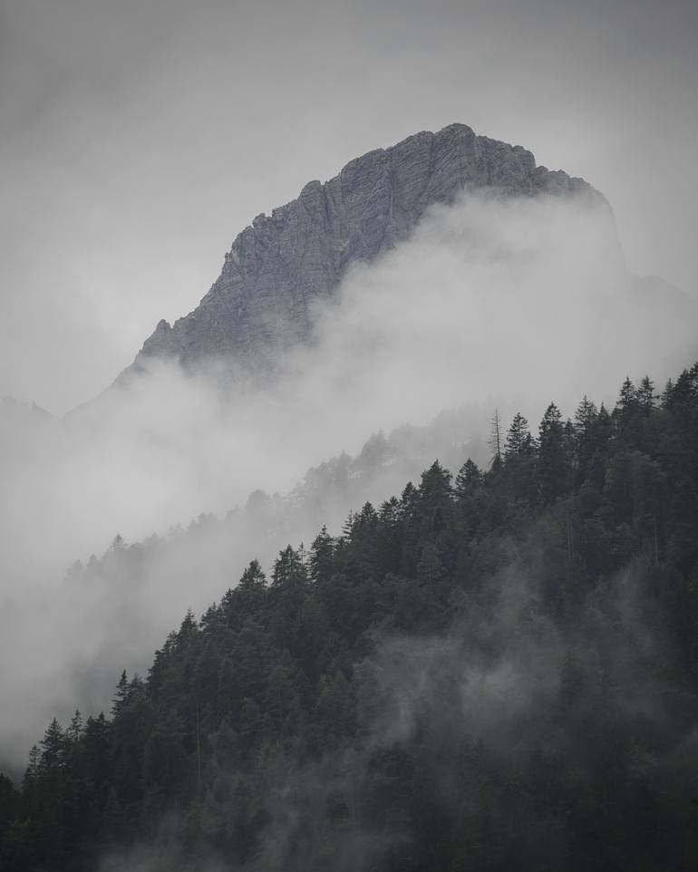 Amid whispered skies, the mountain stands as a timeless sentinel, crowned in stone and veiled in mist. Evergreen forests bow beneath, their branches laced with drifting fog like messages to the heavens. Silence here is sacred, humming with unseen presence. In this stillness, nature whispers its wisd...