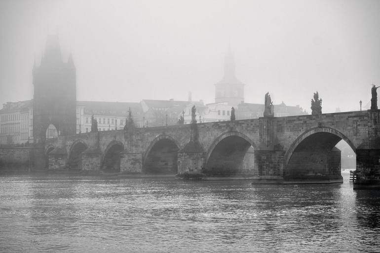 This photograph captures the serene stillness of Prague, drawing inspiration from the city's timeless beauty. The iconic Charles Bridge, shrouded in a soft mist, evokes a sense of quiet reflection. The atmospheric scene transports you to the heart of this ancient city, inviting contemplation. Creat...