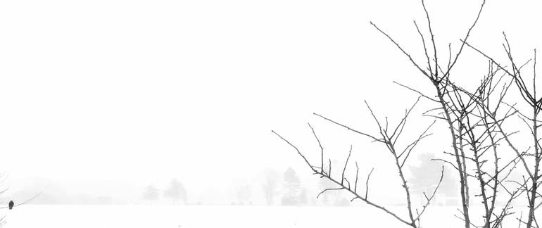 This black and white photograph captures the stark beauty and quietude of a winter landscape. The image focuses on a cluster of bare trees, their branches reaching skyward like delicate lace against the muted backdrop of the season. A few small birds perch on the branches, adding a touch of life a...