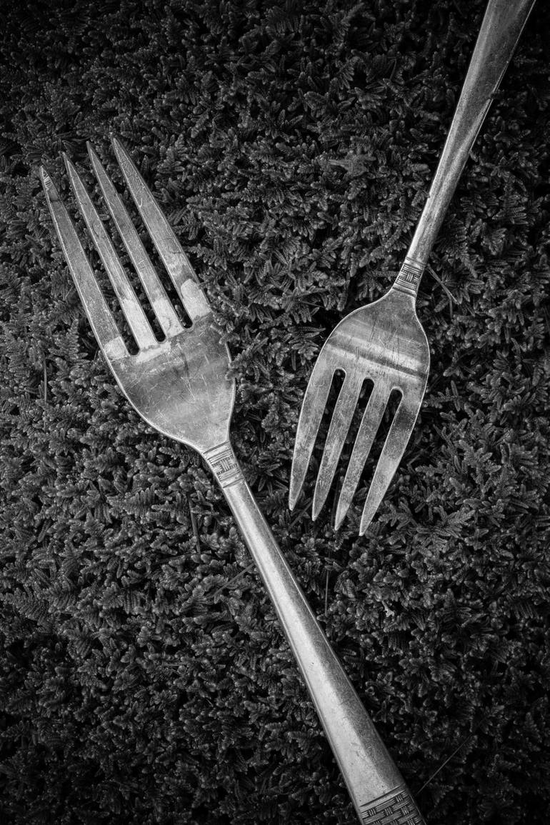 Antique silver forks on a bed of moss in a black and white still life photography by Edward M. Fielding