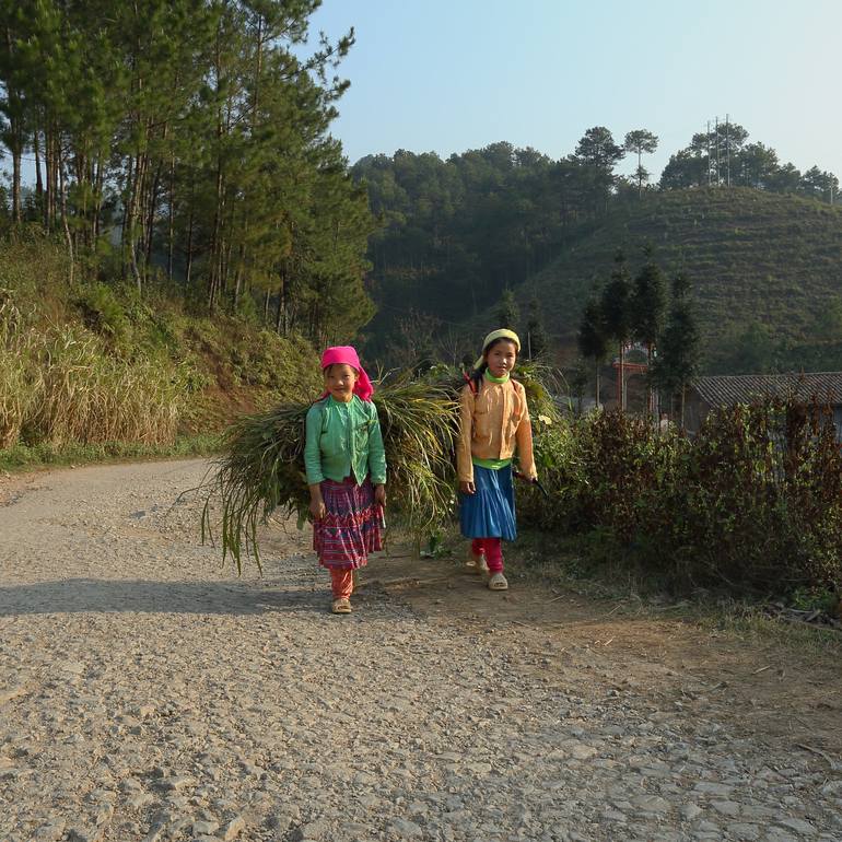 Two small figures cast long shadows on the dirt path in the twilight. Heavy bundles of grass on their shoulders, like a silent song of sharing, of responsibility, and of the resilient beauty of the two young sisters amidst the majestic mountains. Can you hear the echo of their small footsteps in the...