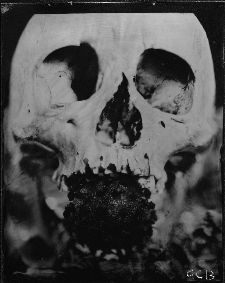 Tintype of Skull with orange framed in oak. Tintypes are one offs. Each tintype is original and unique. Hand coated aluminum plates with collodion. Sensitized in silver nitrate and shot in camera while still wet.