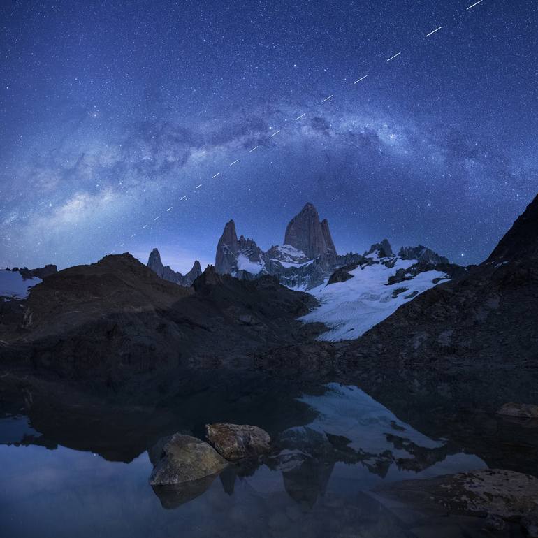 Star Link satellites and a brilliant galactic core rise over the iconic Argentinian mountains of Fitzroy. All large prints are an edition of 3, and are available in 20x30, 32x48, 40x60 & 48x72 (or similar size depending on the format of capture). All images medium format film camera or D850, and p...