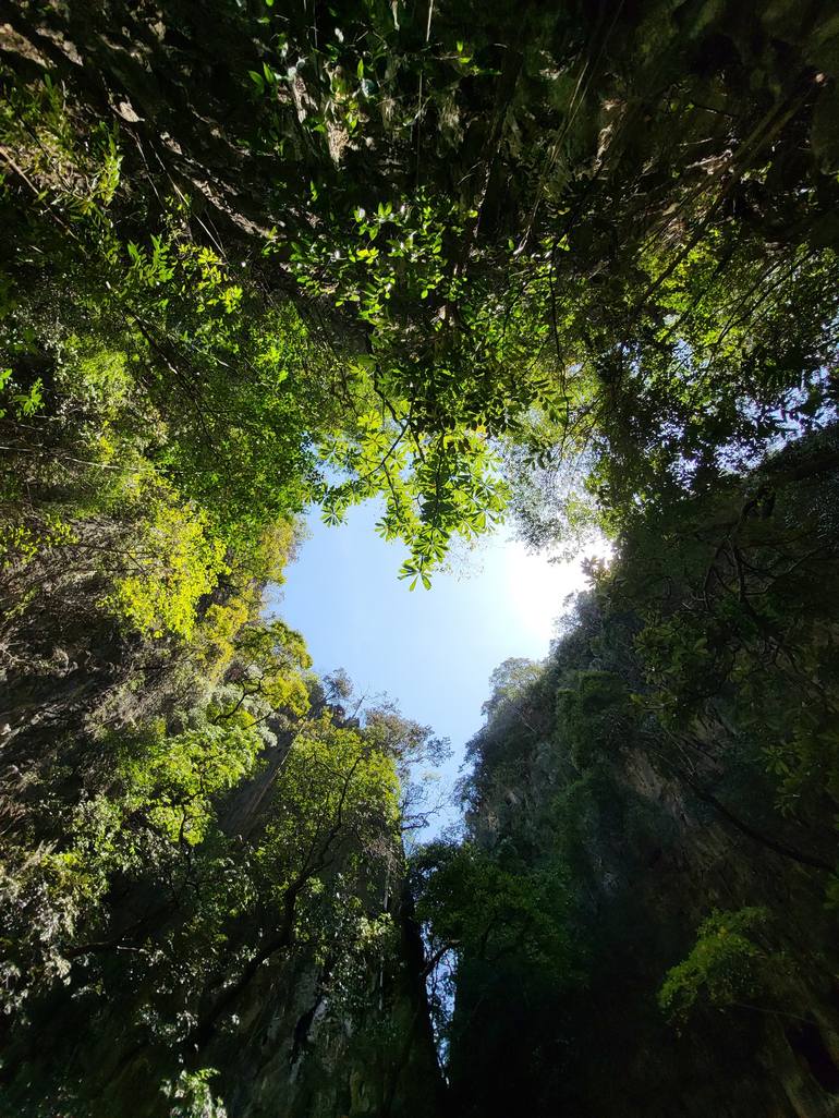 Captured from below in a breathtaking rocky island landscape, this photograph reveals a naturally formed heart in the sky. Towering cliffs and lush trees curve inward, framing a brilliant blue opening above. The rugged textures of the rocks contrast beautifully with the soft, open sky, creating a st...
