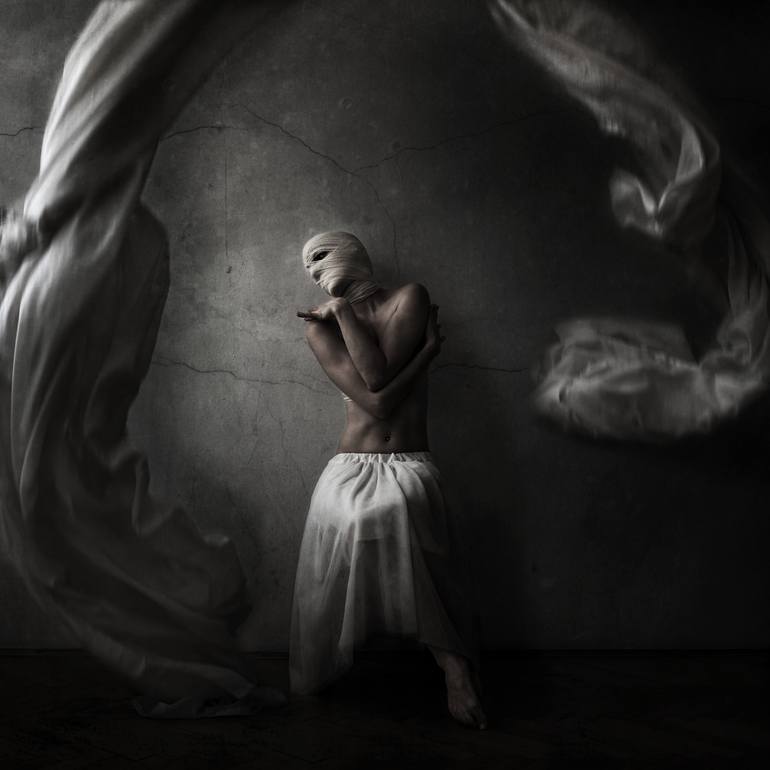 This photo is a self portrait and it was taken with a Canon 5d Mark II in my apartment in front of a white wall. Light that I used is natural and it's coming from my window on a cloudy day. To achieve this effect of clouds and dark mood I used textures in post production. Image is expanded into a ...