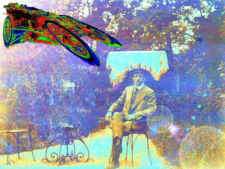 Oldtimerauto in psychedelischen Farben über Mann mit überschlagenen Beinen unter Tischdecke im Garten