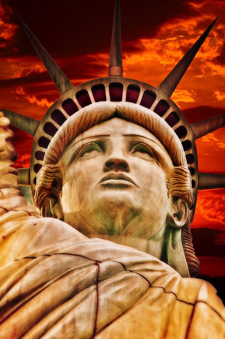This captivating photograph features a close-up view of the iconic Statue of Liberty, a symbol of freedom and democracy. The image focuses on the statue's face and crown, capturing the intricate details of Lady Liberty's expression and the radiating spikes of her diadem. The statue's weathered coppe...