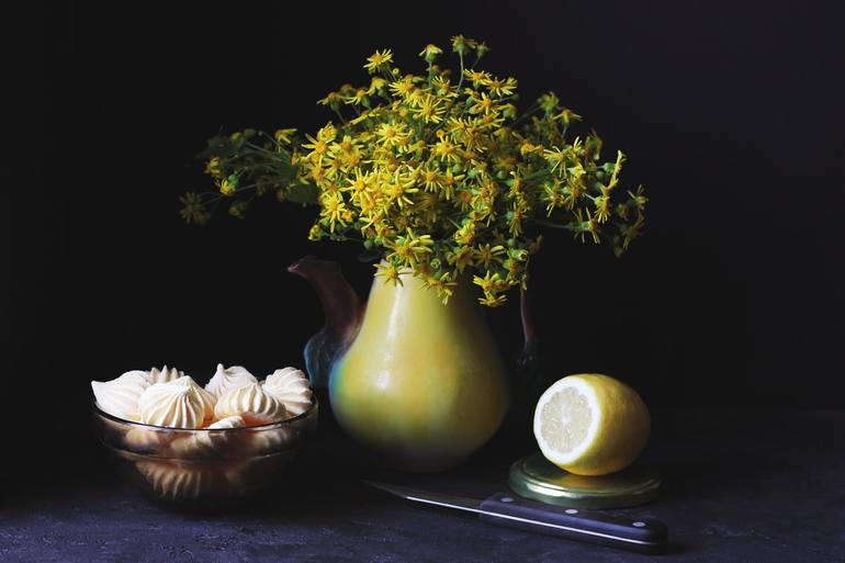 The work was inspired by the wild flowers I found growing in my garden. I have found the matching yellow teapot in my kitchen to use it as a vase. A lemon and some yellow candies have also come in handy to make a monochromatic picture.