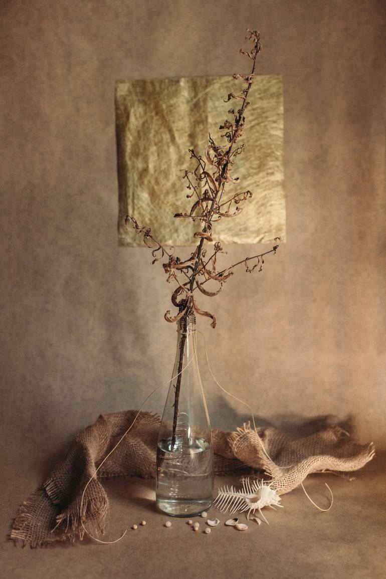 "Earth Life" is a thought-provoking still life photograph exploring the essence of human existence. The composition features carefully arranged symbolic elements: a dry branch representing a state of mind, shells symbolizing conception and birth, and a vessel of water embodying the physical self. A ...