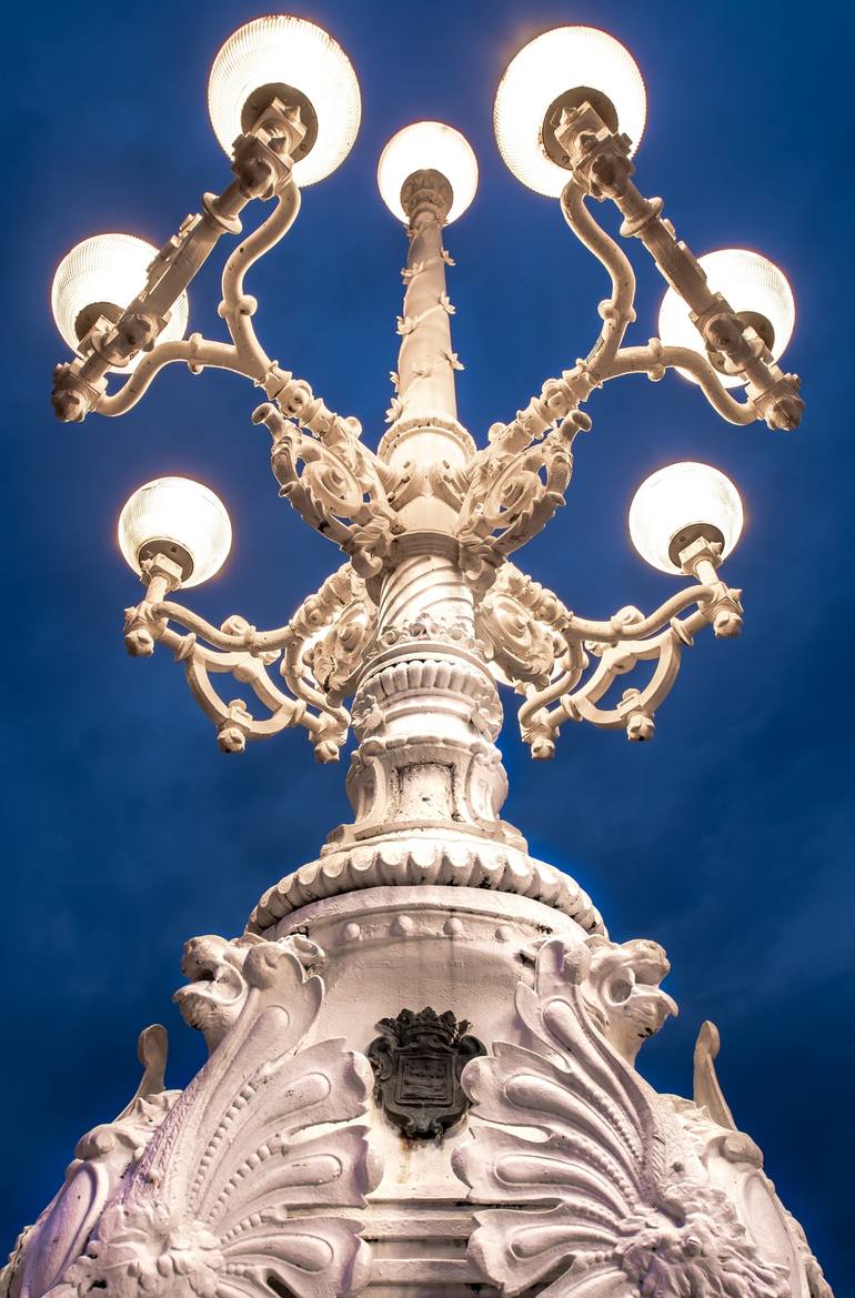 This captivating colour photograph captures a famous street light along the seaside promenade of Donostia San Sebastian in the Basque Country of Northern Spain. The photorealistic image, printed as a C-type photogram on paper, presents an abstract yet documentary-style view of this iconic architectu...