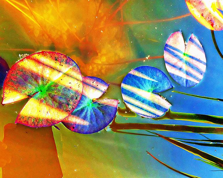 Summer's Day and eating by our pond, seeing new lilies emerge and eventually take over the surface of the pond. They can be quite fascinating to look at in detail but for this picture I have emphasised their colours to create a fun appearance. Best tuned end-up to view as the original.