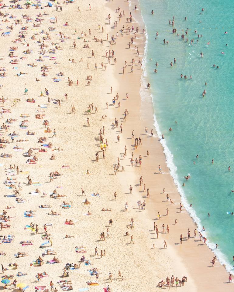 INSPIRATION "Summer Time V" captures the universal joy of a peak summer day at Praia do Norte in Nazare. While famous for its giant winter waves, this image reveals the softer side of the Atlantic—a tapestry of colorful umbrellas, sun-seekers, and the vibrant turquoise embrace of the ocean. THE V...