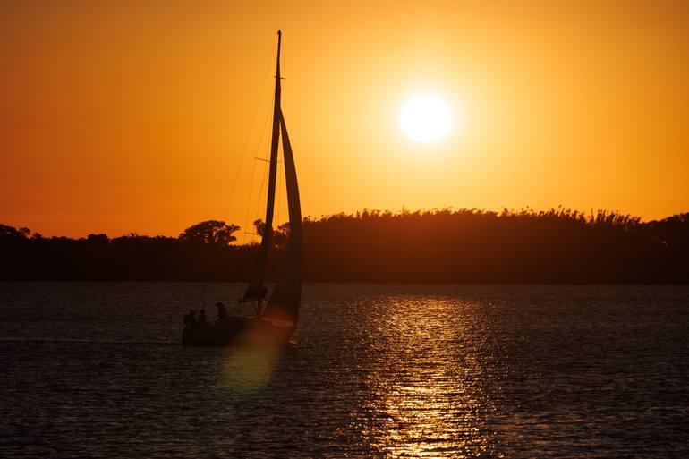 We met some friends at the shore of Guaiba river in Porto Alegre. The sun started setting and the boats were sailing quite close to us. We took some pictures, but this sailing boat was just going towards the sun. I waited for it to get to the perfect position and got the picture.