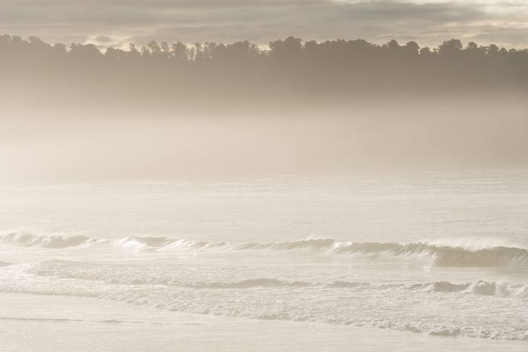 Sunset on the coast of New Zeland. The wind raises the sea dust into the air, creating a fog