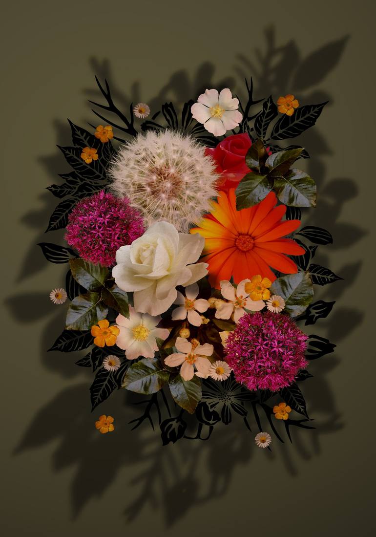 Supernature Collection: Gallery Editions, Series of Six Addition to an ongoing collection of floral artworks. Photographic and digital painting compositions. The composition consists of wild and cultured flowers and greenery with additional abstract illustrations set against a striking shadow backg...