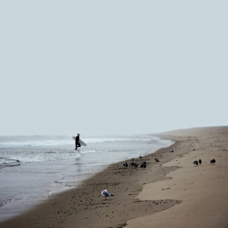 A lone surfer exits the water on a foggy Cape Cod day. While this version is square, I offer another version on Saatchi where the surfer is quite small compared with the sea, sky and beach that surround him. I composed the image this way to emphasize the size and power of the ocean and the vastness ...