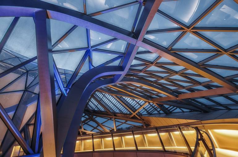 Swinging into the Dusk - The glass crystal of the foyer in the new museum with its deconstructivistic architecture blends the swinging structure of the building and its facade together with the properties from transparencies and reflections combining interior and outside activities and characteris...