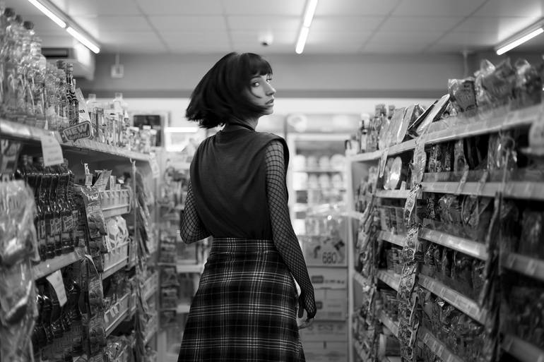 A glimpse into the past through the aisles of a store. There was very little time, and we were in a hurry; she quickly walked between the shelves of the convenience store. I had a camera in my hands and invited her attention. I managed to capture her look and emotion.