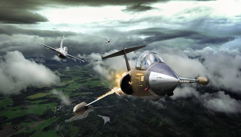 Real aircraft. But montage´d together in many layers. I was striving for a real realistic look, but with a tint of adventure and a vantage point not seen in a regular photo capture. Air combat from the imagination..
