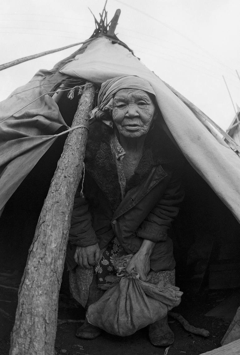 This black-and-white portrait captures Varvara Chempogir, an Evenk woman, standing at the entrance of her summer chum in the Khantai Lake settlement, Taymyr Peninsula. In her hands, she holds a small bundle of personal belongings—a glimpse into the simplicity and resilience of her life. The settleme...