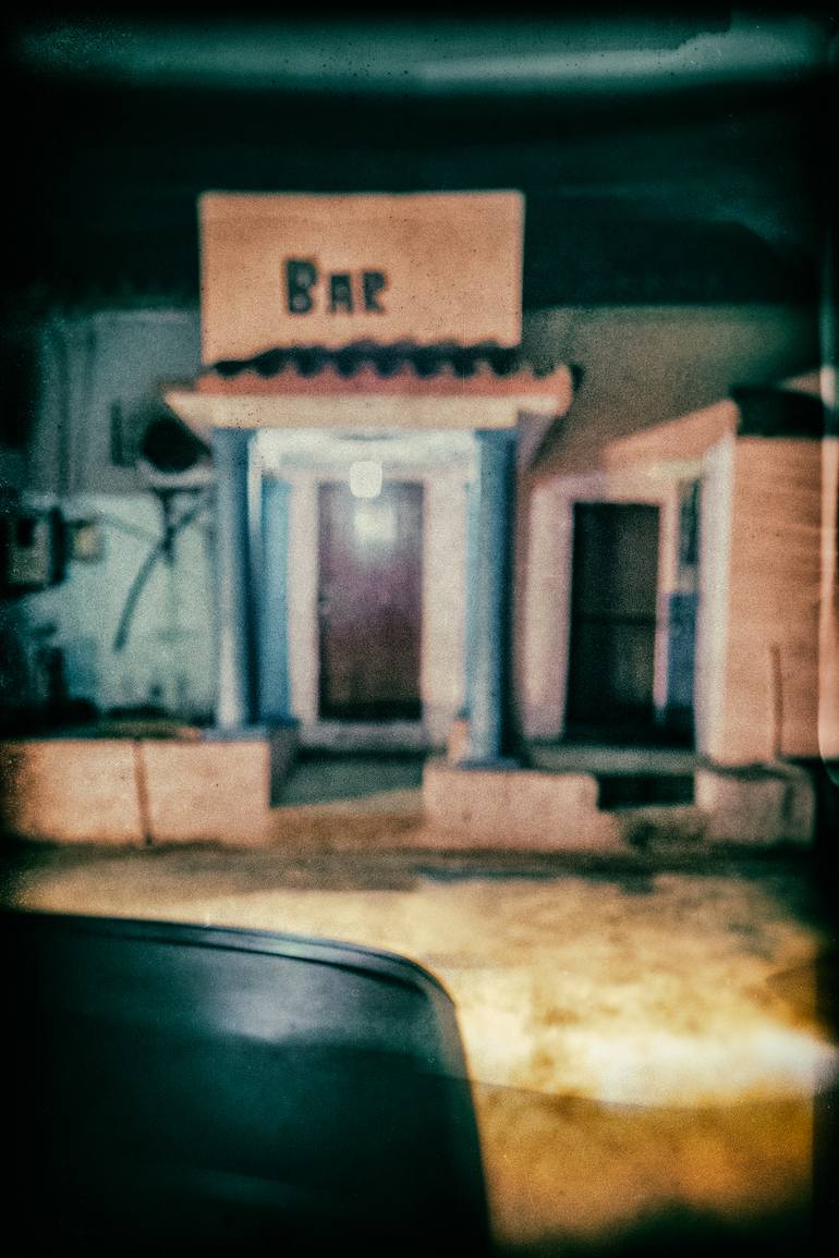 Conceptual night-time piece, an uninviting quiet bar with a car sat with lights on waiting for someone. The defocused and grainy qualities add to the sense of mystery and tension. Vinales, Cuba. Using a wet plate technique to emulate the old large style pioneering cameras of a bygone era and giving...