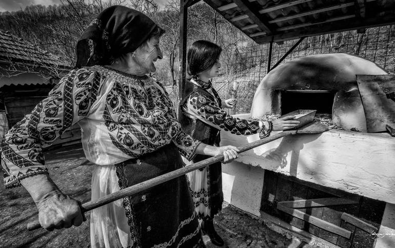 "The Bread Oven" captures a timeless scene of rural life, where the simple act of baking bread carries profound significance. This black and white photograph immortalizes a woman tending to a traditional oven, the heart of the home where essential nourishment is created. The image evokes a sense of ...
