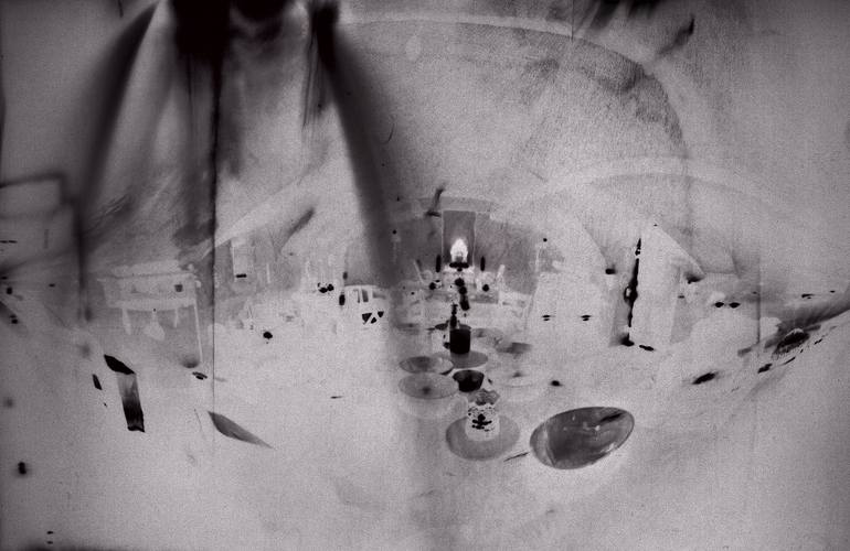 an old, caved room in a farmershous. build in 14 century. the lighting of the camera obscura photography is by candles. it took two days (many candles) of exposure time with the pinhole camera. there is a negative print and a positive print of this picture. since i used round camera, the complete ca...