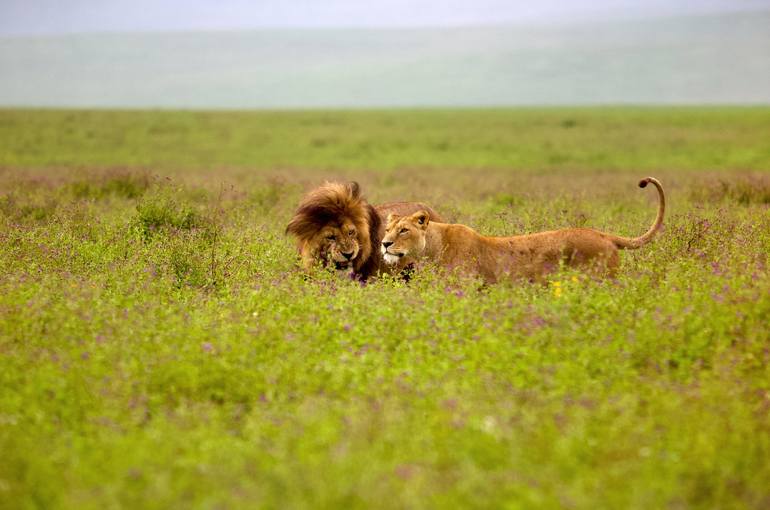 This captivating photograph portrays a tender yet regal interaction between a pair of young African lions (Panthera leo) in the lush grasslands of the Ngorongoro Conservation Area, Tanzania. The lioness stands proud and aloof, her gaze confident and resolute, while the male exudes a blend of charm a...
