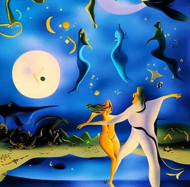 The A.I. created surreal interpretation from my description representing a mermaid dancing with her partner on the sea floor as various species of fish and other creatures observe and they swim past.