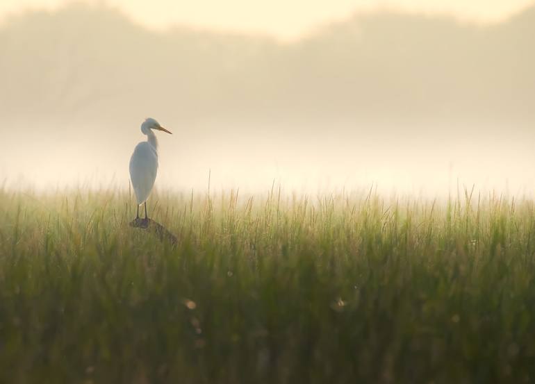 Morning mist gently blankets the landscape as an egret patiently waits for the first golden rays to touch the dewy grass. Captured at a local bird sanctuary, this serene moment embodies the quiet beauty of nature at dawn. Now available as a high-quality archival print, ensuring longevity and rich d...