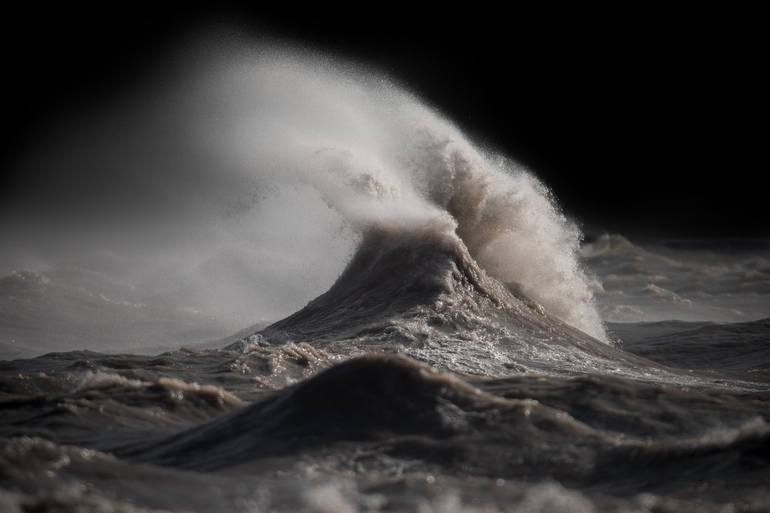 A moody and dramatic image capturing a wave that appears to be exploding out of the water during the annual spectacle known as the Gales of November. The dark background and the powerful surge of the wave create a sense of chaos and awe. The force of the wave, breaking and spraying in all directions...
