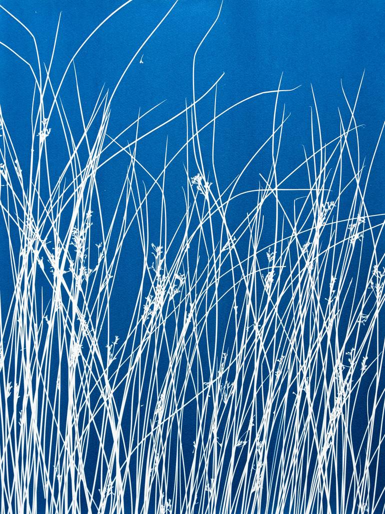 ON EXHIBITION UNTIL MAY 1, 2024. If unsold, it will once again be listed for sale here on Saatchi Art. This is the original artwork. This monotype was made with fresh-cut Native Californian wild grass from my garden. The species of tall marsh grass is called Gray Rush or the latin name juncus pate...