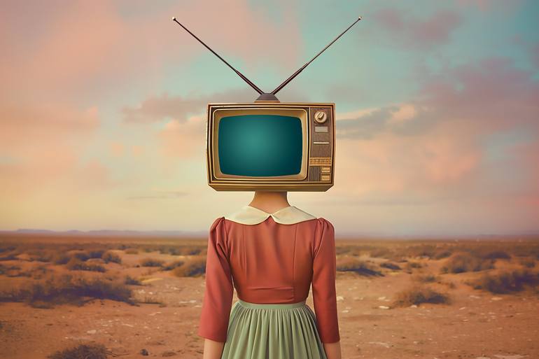In this piece, I explore a surreal blend of technology and humanity wherein a figure stands with a vintage television set for a head, its screen blank against a desolate landscape at dusk. The juxtaposition evokes a poignant commentary on media's influence on identity and perception.
