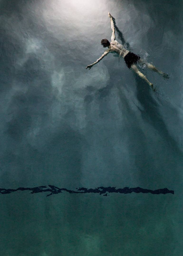 Dive in or take flight. Complete freedom for the subject, seamlessly suspended, no pressure from the surroundings in all directions. The currents of the water daub the light into thick folds of oil paint and offer depth to the subject as he takes flight towards the light.