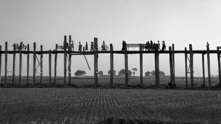 U Bein Bridge is a crossing that spans Taungthaman Lake near Amarapura in Myanmar. The 1.2-kilometer bridge was built around 1850 and is believed to be the oldest and longest teakwood bridge in the world. I decided to move away from it and frame the bridge's silhouette at sunset as it cut through th...