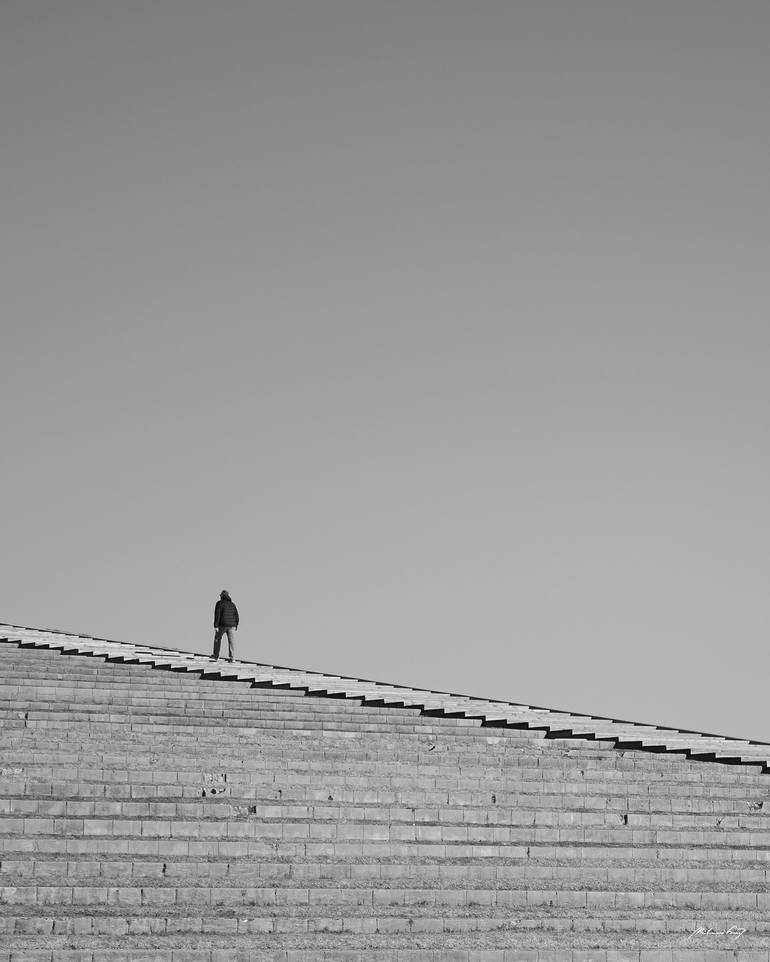 This captivating black and white photograph, "The Ascent (BW)," captures a solitary figure ascending a grand staircase. The artist waited patiently to capture this minimalist composition in a park in Madrid, Spain. The result is a striking image that emphasizes the scale of the staircase and the ind...