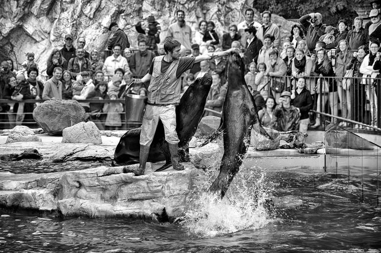 Fineart street photo in black and white Feeding of sea lions before audience by an animal care attendant in the zoo of Schoenbrunn in Vienna, Austria. The image begins as a real photograph, expertly transformed through digital techniques. It's then printed as a C-type print using lightjet laser exp...