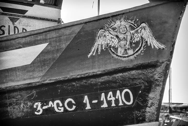 Fineart street photo in black and white Fishing boat at the harbour of Puerto de Mogan with a naked peeing angel at the bow, Grand Canary, Canarian islands, Spain. The image begins as a real photograph, expertly transformed through digital techniques. It's then printed as a C-type print using light...