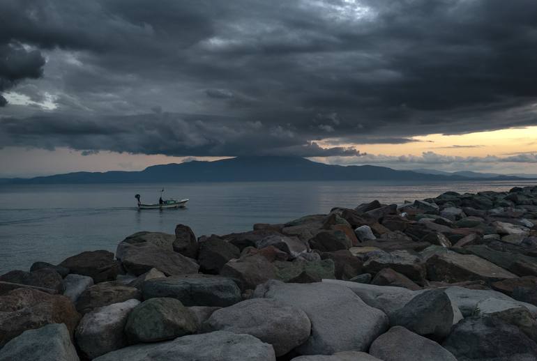 The port of Assos: The greek island of Mytilene in the distance Print