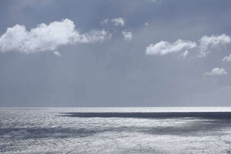The play of colors, light with shadow on a sunny day on the canvas of ocean and sky. The wind makes the texture of the water in relief, and the light adds silver accents to the surface.
