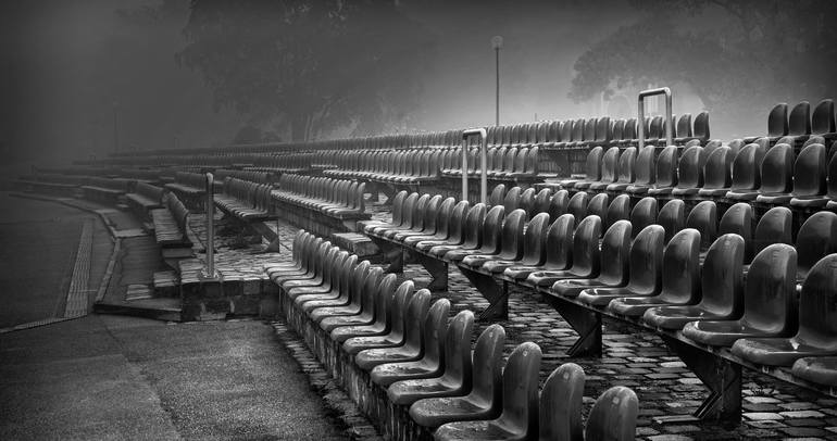 Fineart photo in black and white Rows of chairs on a permanent stony stand at the Danube river landing of Tulln at heavy fog, Austria Limited edition for collectors: Lightjet laser exposure on baryta-coated paper Plus white margin of 3cm 10 copies for sale and one artist copy Each individually autog...