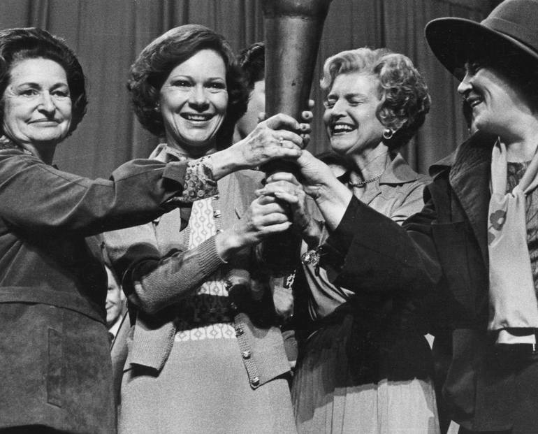 At the opening of the First National Women's conference, as its official photographer Diana Mara Henry made this image of Lady Bird Johnson, Rosalynn Carter, Betty Ford and Congresswoman Bella Abzug, chair of the President's commission on the Observance of International Women's Year. They hold the t...